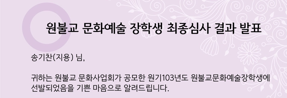 원불교사상연구원 송지용 연구보조원이 제3회 원불교문화예술 장학생으로 선정되었습니다.
